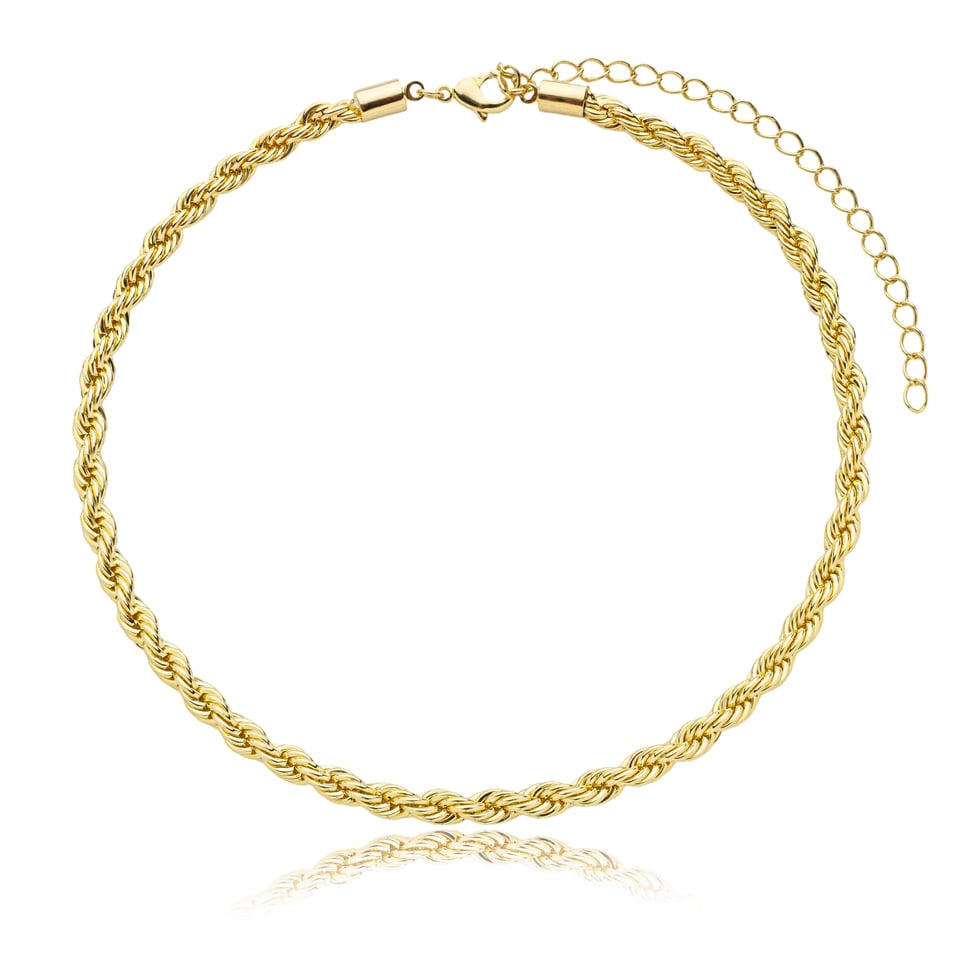 Dimensões: Corrente com 32,5 cm de comprimento aberto mais 10 cm de corrente extensora para ajuste; 5 mm de largura.