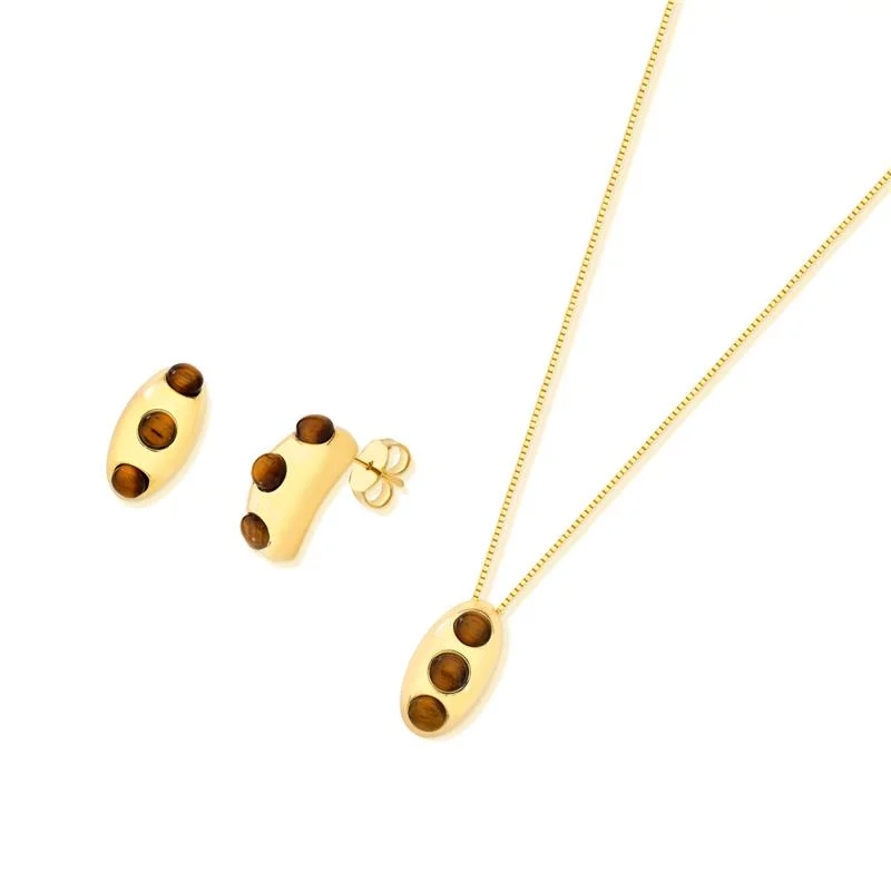 Colar e brinco banho de ouro com pedra natural olho de tigre.