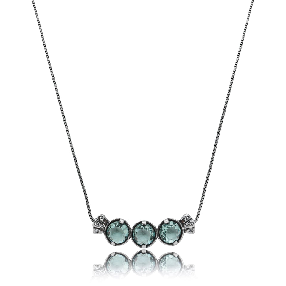 Colar corrente banho de prata com pingente fixo contendo 3 cristais cravejados na cor verde água e aplicação de strass na cor branco (cristal).