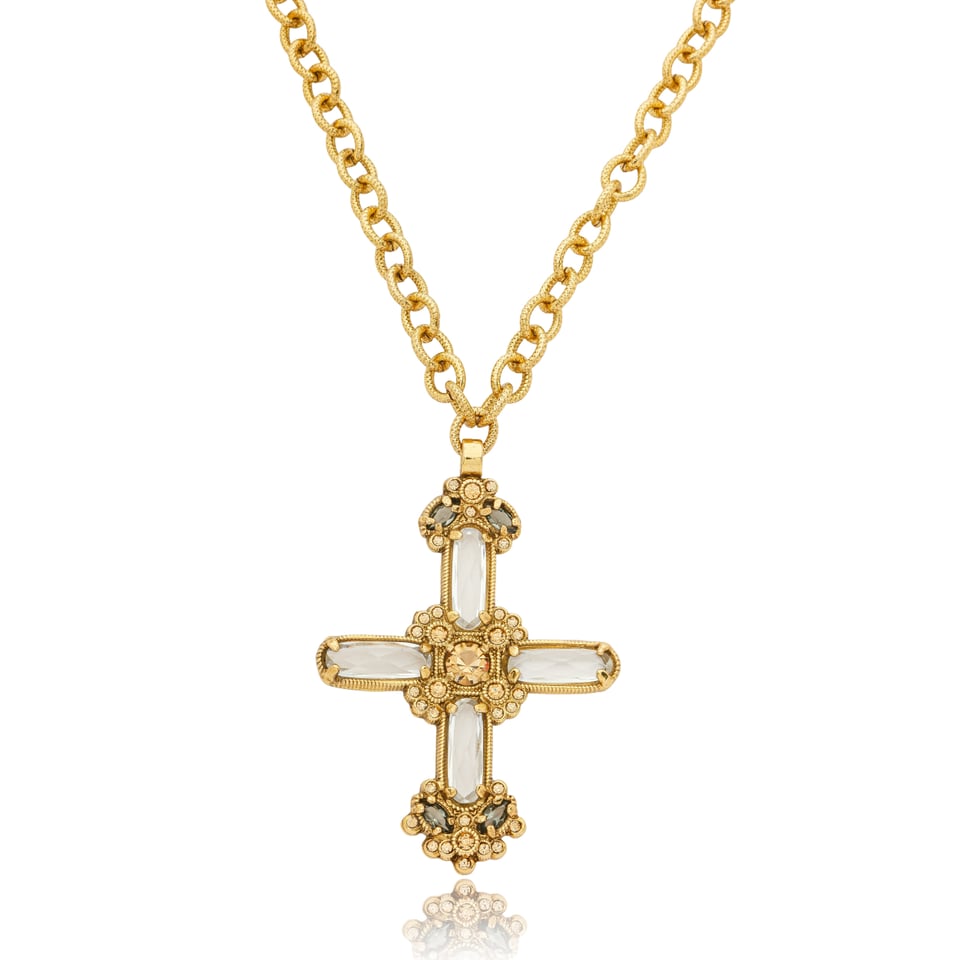 Colar longo corrente banho de ouro vintage com pingente de crucifixo ccom cravação de cristais nas cores branco (cristal), fumê e dourado.