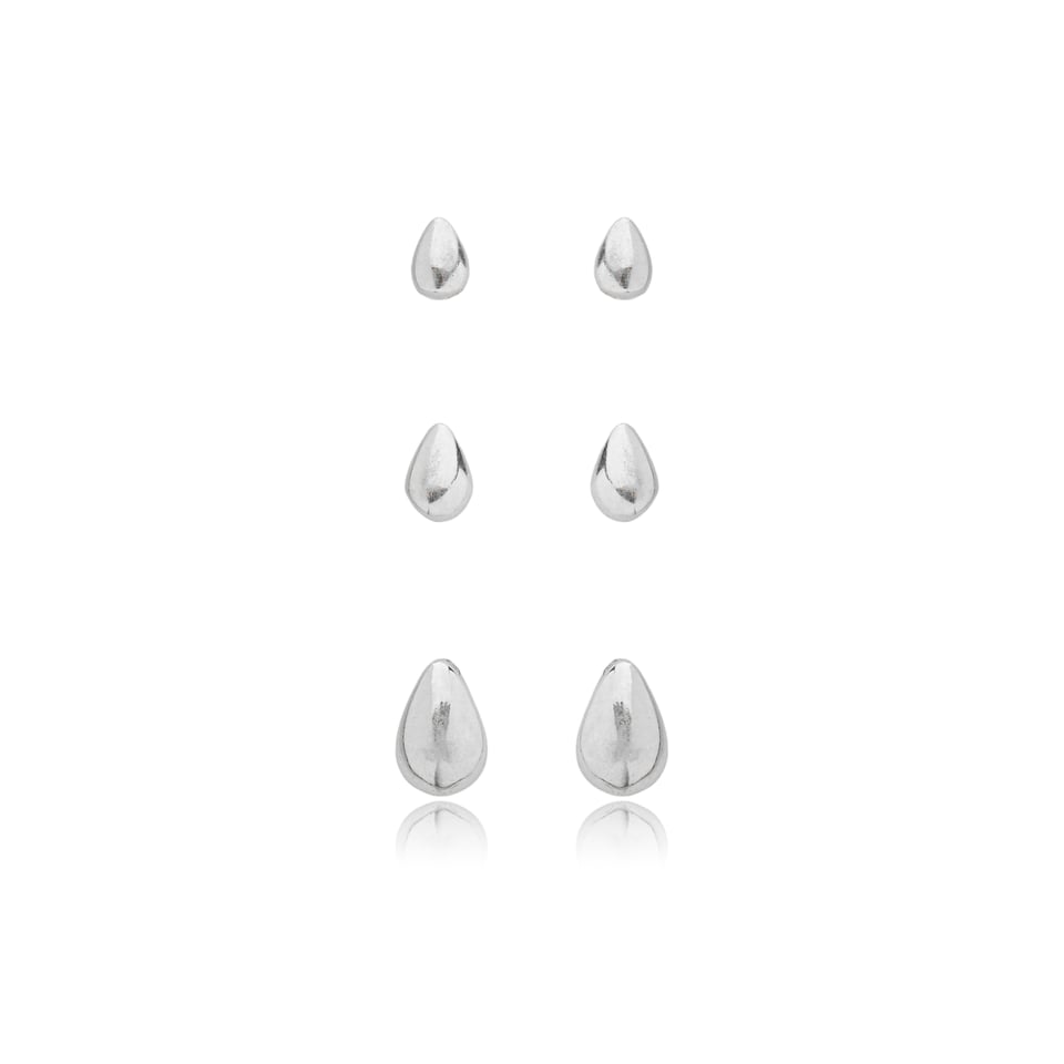 Kit com 3 brincos em prata 925 em formato de gotinhas no metal liso polido.
