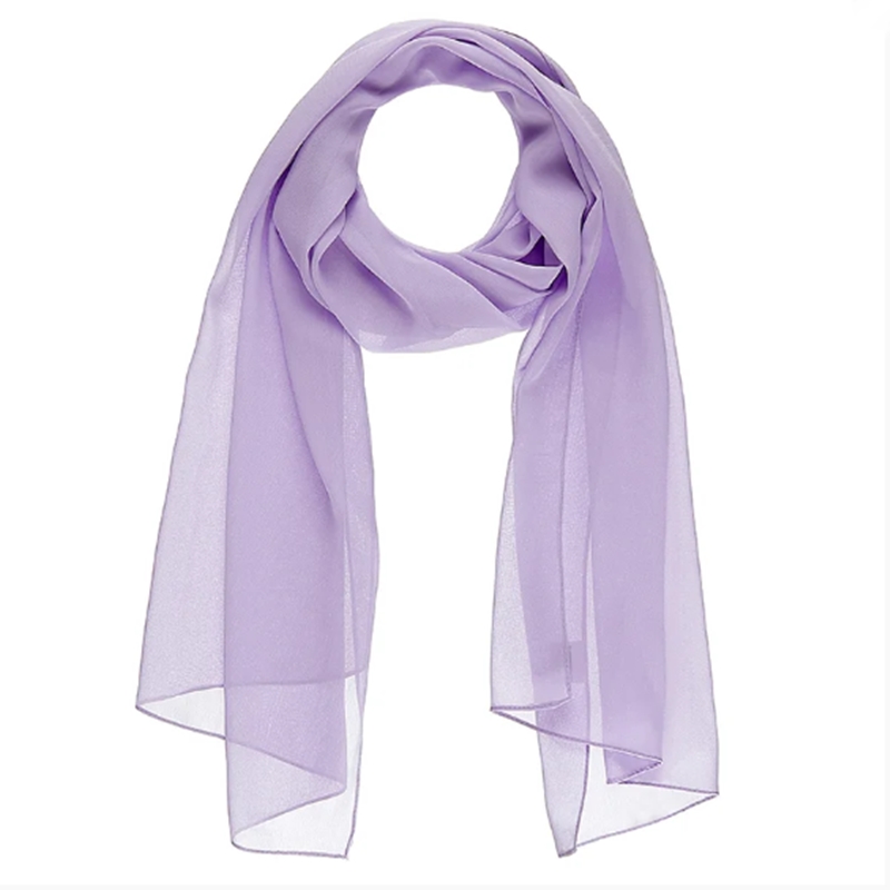 Lenço tipo echarpe de tecido 100% poliéster na cor lilás lavanda.