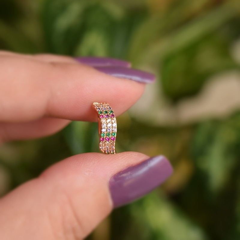 Piercing de encaixe banho de ouro com micro zircônias coloridas cravejadas.