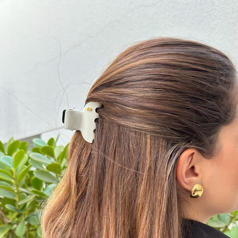 Piranha com material de acrílico nas cores branco e preto, possui mola aço em inox com formato em B (patenteado).