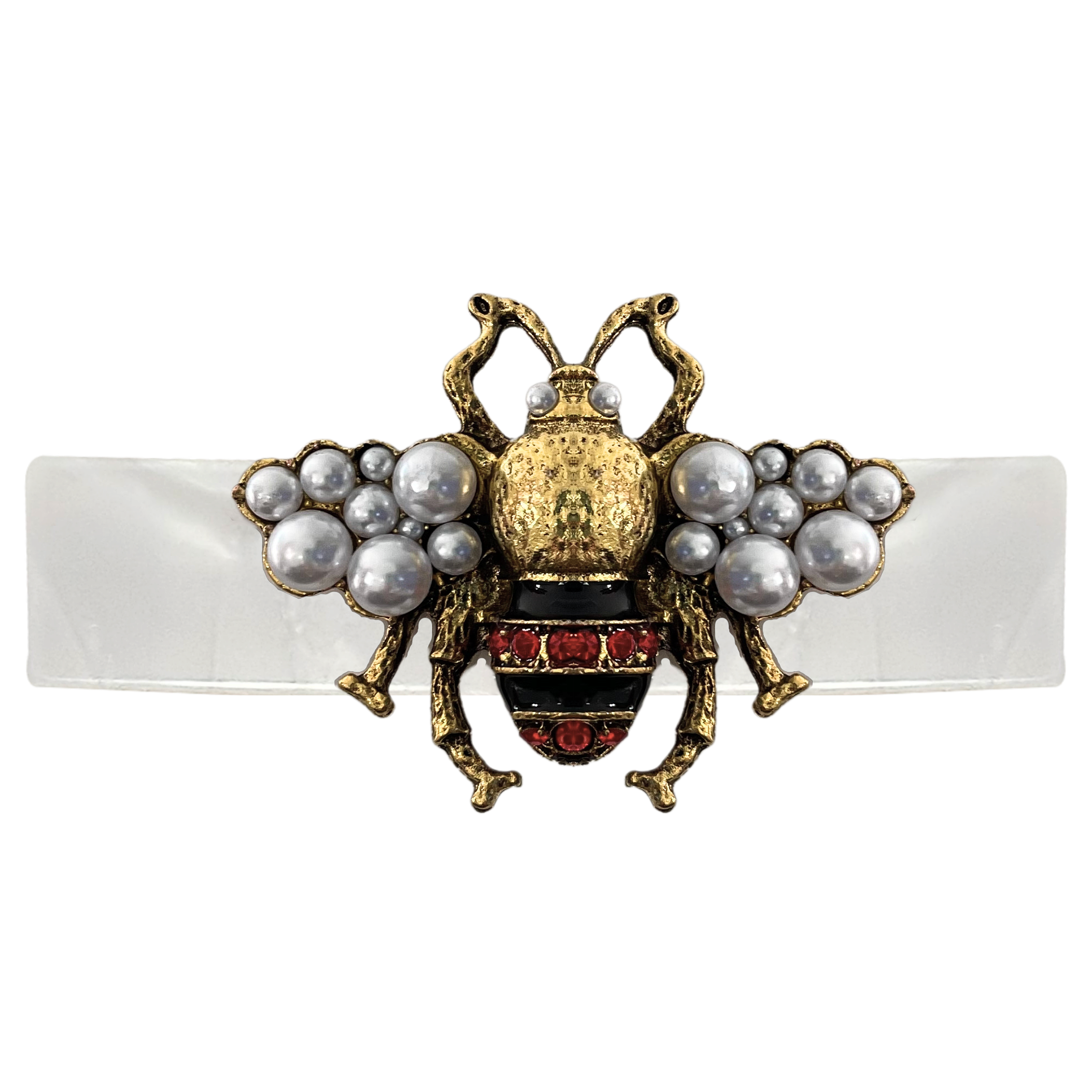 Presilha metal prateado com acetato imitando madrepérola e abelha de metal dourado com aplicações de pérolas e cristais na cor vermelho.