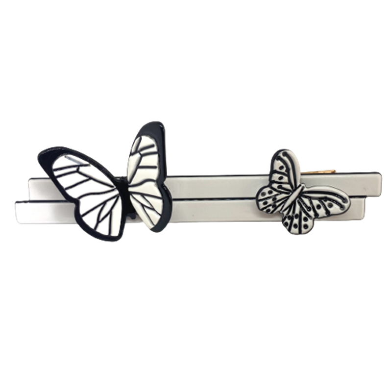 Presilha bico de pato metal dourado com acetato na cor branca com bordas preta e aplicação de borboletas de acetato.