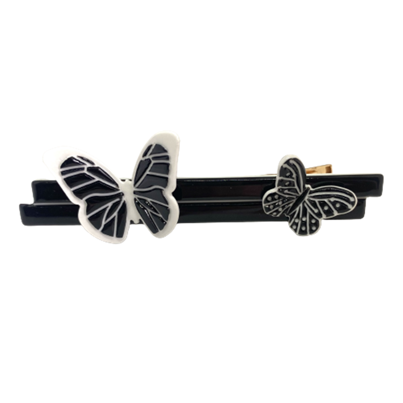 Presilha bico de pato metal dourado com acetato na cor preto com bordas brancas e aplicação de borboletas de acetato.