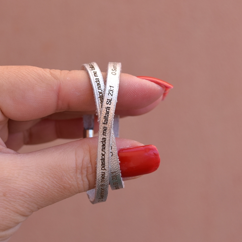Pulseira de couro ecológico na cor prata com o Salmo: "O Senhor é meu pastor, nada me faltará.",