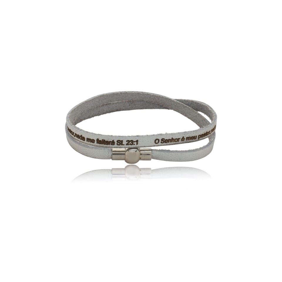Pulseira de couro ecológico na cor prata com gravação do Salmo 23: “O Senhor é meu pastor, nada me faltará.”, uma mensagem de fé, proteção e confiança. Possui fecho magnético (ímã) com acabamento em metal prateado, garantindo praticidade e segurança no uso. Um acessório delicado e cheio de significado, ideal para expressar espiritualidade com elegância no dia a dia ou presentear com devoção.