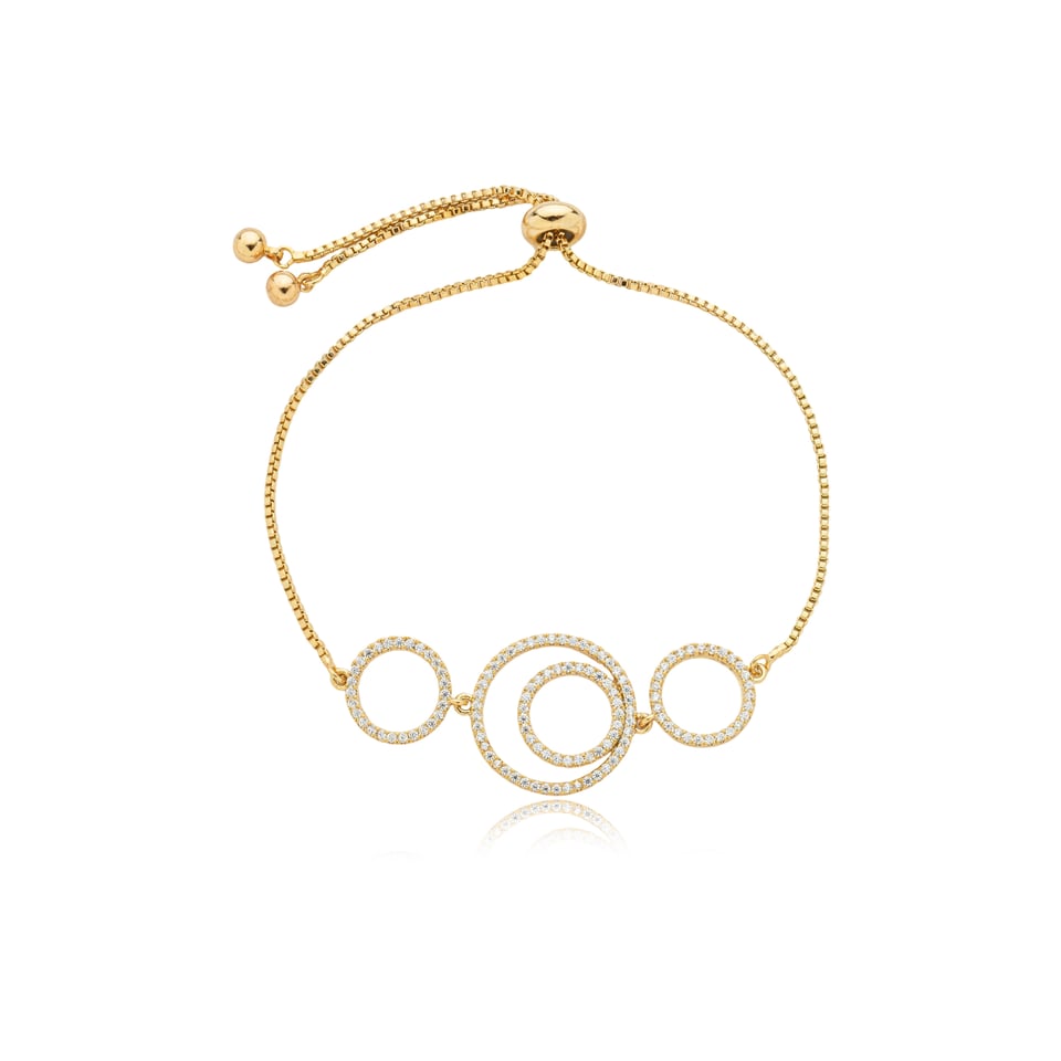 Pulseira banho de ouro com cravação de micro zircônias na cor branco (cristal); e acabamento de esferas lisas nas pontas das pulseiras.