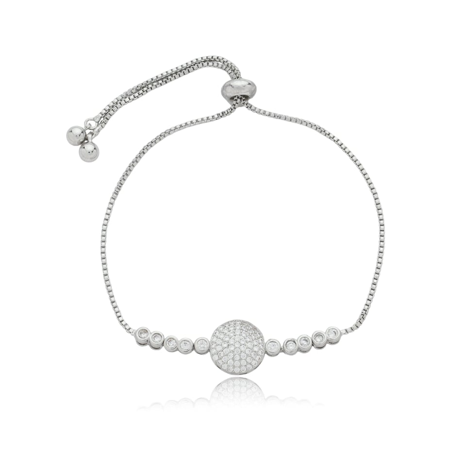Pulseira banho de ródio com cravação de micro zircônias e zircônias redondas na cor branco (cristal);  e acabamento de esferas lisas nas pontas das pulseiras.