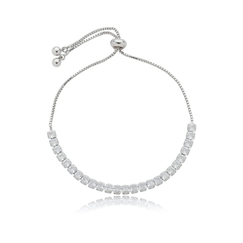 Pulseira banho de ródio com cravação de zircônias na cor branco (cristal); e acabamento de esferas lisas nas pontas das pulseiras.
