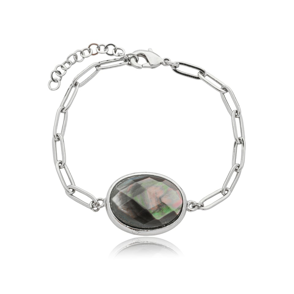 Pulseira banho de ródio de corrente de elos com madrepérola negra oval.