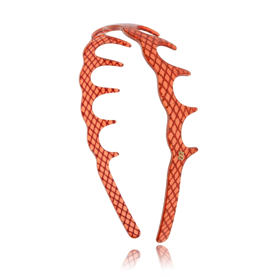 Tiara em acrílico de alta qualidade com dentes largos na cor vermelho com detalhes rendados no glitter.