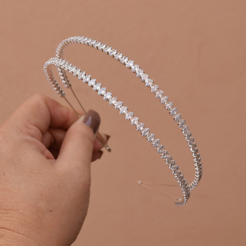 Tiara aro duplo metal prateado com cravação de zircônias navetes na cor branco (cristal).