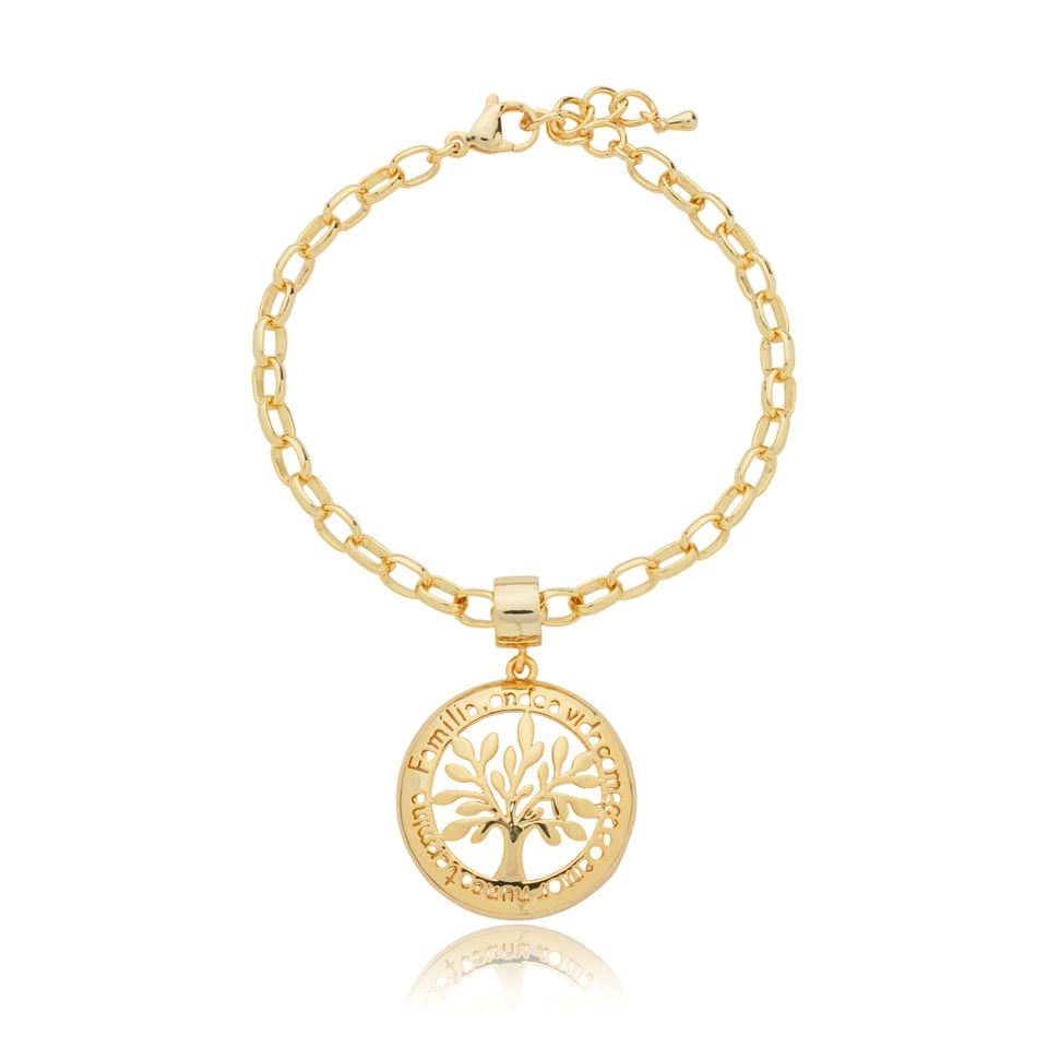 Pulseira banho de ouro com pingente redondo vazado com árvore da vida com a frase: Família, onde a vida começa e o amor nunca termina.