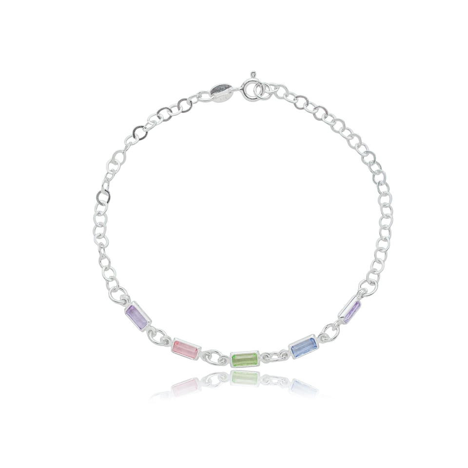 Pulseira de corrente em prata 925 com cristais coloridos retangulares.