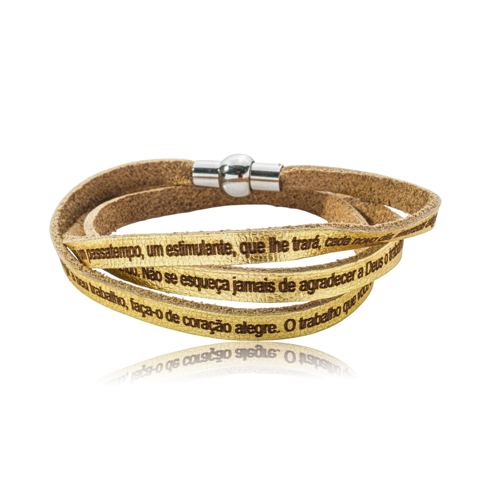 A Pulseira Fernanda Villela Couro é um símbolo de fé e proteção, confeccionada em couro ecológico na cor dourada com fecho magnético no metal prateado que garante praticidade e conforto ao usar.