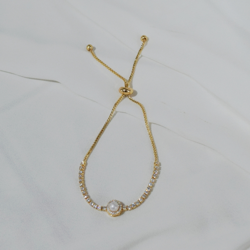 Pulseira fecho gravatinha banho de ouro com zircônias cravejadas na cor branco (cristal) e aplicação de pérola.