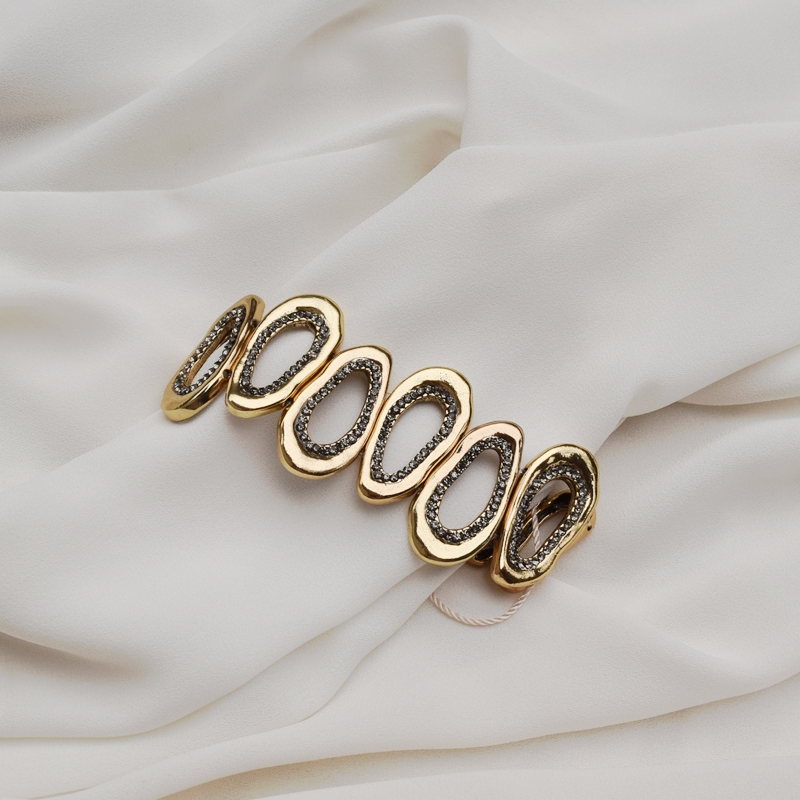 A Pulseira Nino Bran traz fios de silicone e placas com design orgânico com banho de ouro vintage, realçados pela cravação de cristais Swarovski na cor Black Diamond.