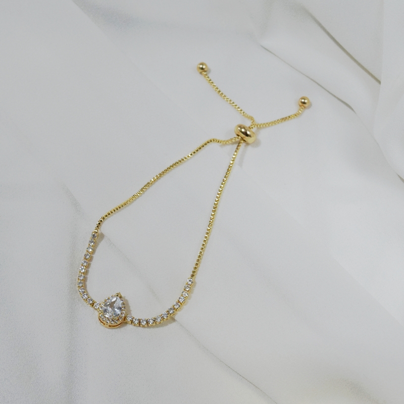 Pulseira riviera gravatinha gota banho de ouro, uma semijoia elegante e atemporal com zircônias na cor branco cristal que garantem brilho delicado. O destaque fica para gota central, que traz sofisticação e leveza ao design.