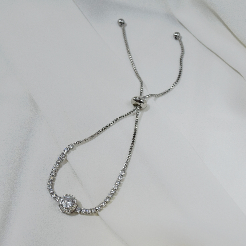 Pulseira riviera gravatinha banho de ródio com design delicado e sofisticado, destacando fileira de zircônias na cor branco cristal que proporcionam brilho elegante. O detalhe central com pedra maior traz um toque de destaque e refinamento à peça.