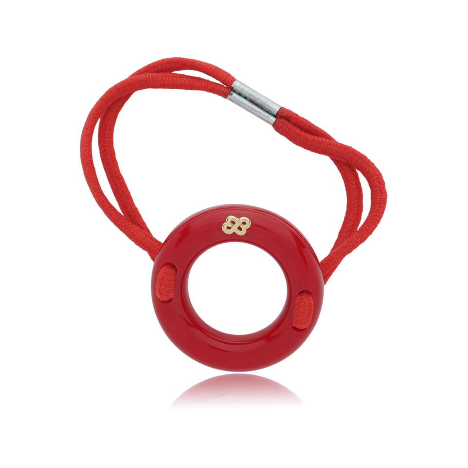 Rabicó com elástico de alta resistência com acrílico redondo vazado na cor vermelho.