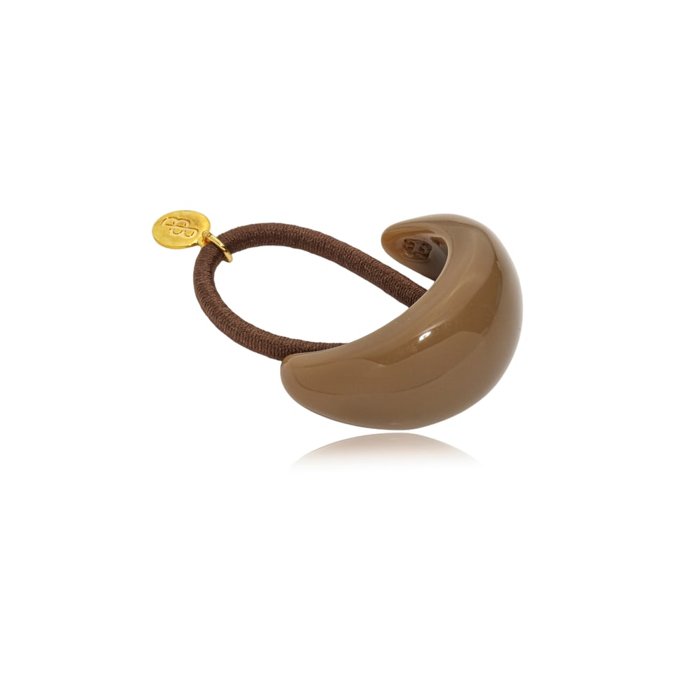 Rabicó com elástico resistente na cor marrom e resina com design bold e acabamento premium na cor latte (bege cremoso e iluminado).