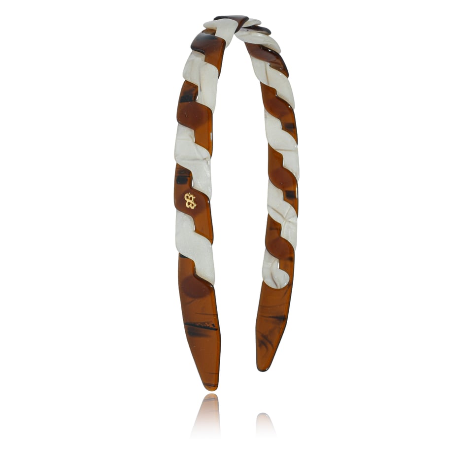Tiara em acrílico de alta qualidade nas cores marrom e marfim imitando madrepérola com design trançado.