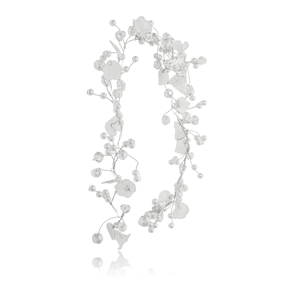 Arranjo de cabelo metal aramado prateado com flores de acrílico e aplicação de cristais transparentes e pérolas.
