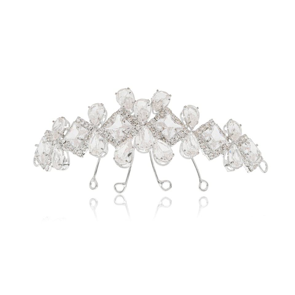 Tiara porta coque banho de ródio com zircônias em gotas e quadradas, e strass na cor na cor branco (cristal).