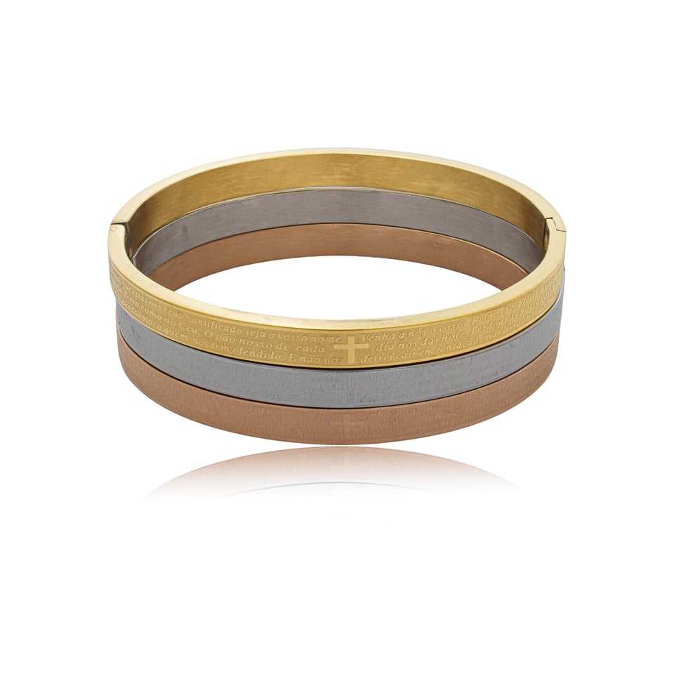 O Trio de Braceletes com a oração Pai Nosso é a união perfeita entre fé, elegância e durabilidade. Confeccionados em aço inox, os braceletes oferecem alta resistência, excelente acabamento e brilho duradouro, sendo ideais para o uso diário.